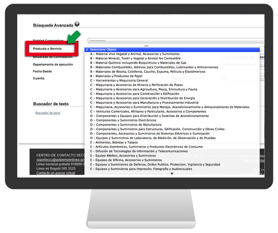 Producto o servicio. Este es uno de los criterios que se consideran más relevantes para la búsqueda de oportunidades en el sistema por parte de las mipymes. Debe anotarse que el Secop tomó como base la codificación estandarizada internacional de bienes y servicios para el comercio electrónico (UNSPC de Naciones Unidas V5-03-01), esta clasificación es jerárquica y se muestra en cuatro niveles: rama, familia, clase, bien o servicio; sin embargo, para definir el objeto contractual el Secop utiliza sólo el nivel 1 (rama) de esta codificación. |
